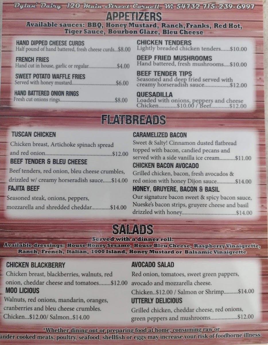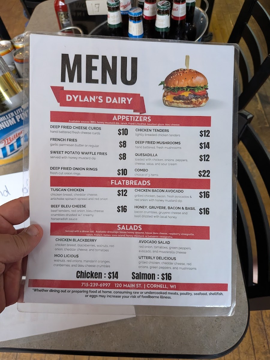 Welcome to Dylan's Dairy, a hidden gem nestled at 120 Main St, Cornell, WI. This charming diner captures the essence of comfort food while sharing a rich narrative through its decor. Customers rave about the exceptional quality of the dishes, from crispy fried cheese curds to delectable flatbreads, all meticulously curated by the passionate owner.
